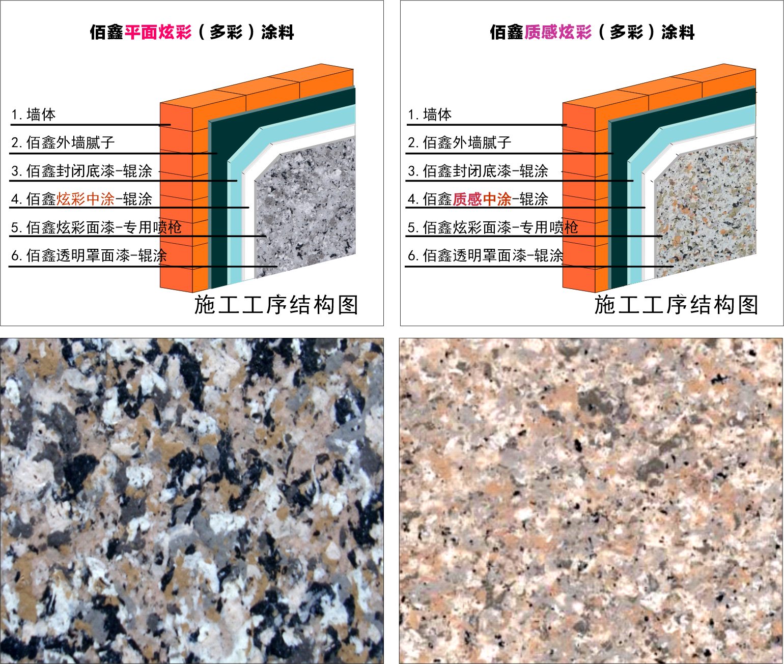炫彩面漆以硅丙树脂作为彩点包覆树脂,有较好的户外耐久性,耐候性,系统老化实验能达2000小时。